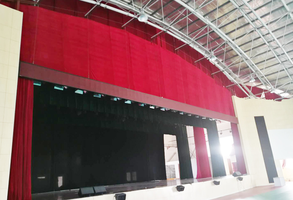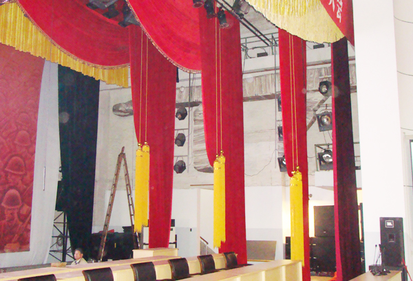 側(cè)簾幕位于舞臺左右兩側(cè),顏色與橫簾幕一致,其對舞臺表演區(qū)域起限制作用,其平行、正“八”字、倒“八”字等吊裝方式可以改變舞臺表演區(qū)平面的形狀,對舞臺后部空間進(jìn)行遮擋,引導(dǎo)、控制觀眾的視線集中在規(guī)定的表演區(qū)內(nèi)。其主要是美化舞臺,遮擋觀眾對側(cè)臺的視線。材料同大幕。