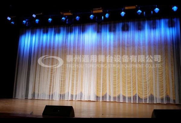 一般不作為場館的固定裝置,是以薄質(zhì)地帶有網(wǎng)狀孔眼的棉布或化纖材料制成的半透明幕布。除本身所具有的輕薄,打摺后可以制作成各種裝飾幕特點(diǎn)以外,還具有一定的透光作用。舞臺上常用白紗幕、黑紗幕、紗畫幕表現(xiàn)場景環(huán)境,從紗畫幕后面向景物投光可以顯現(xiàn)隱藏在后面的人物和空間環(huán)境,從而且易于表現(xiàn)夢幻、回憶的虛擬場面;從前面向紗幕投光可以表現(xiàn)渲染紗畫幕上所畫的形象;從紗幕背面向紗幕投光時,紗畫幕前面所畫的形象看起來則不復(fù)存在。